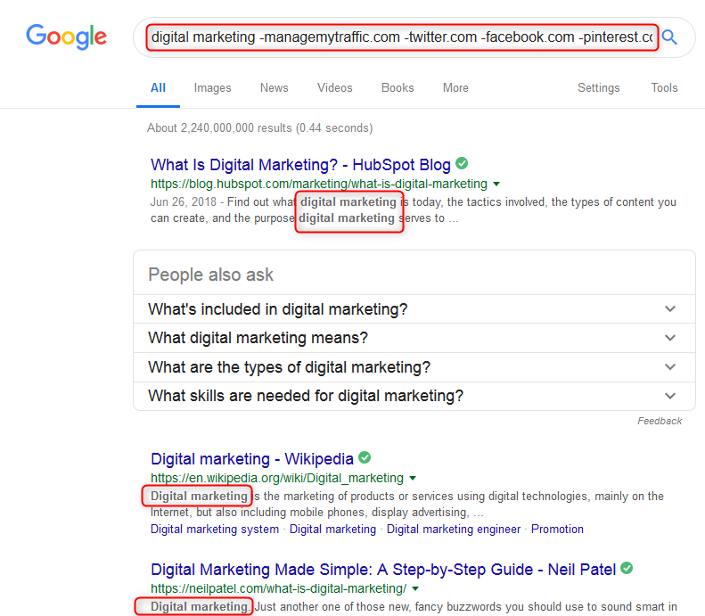 For example, if we wanted to find all mentions of the keyword ‘digital marketing’ except on managemytraffic.com we would use the following search operator: