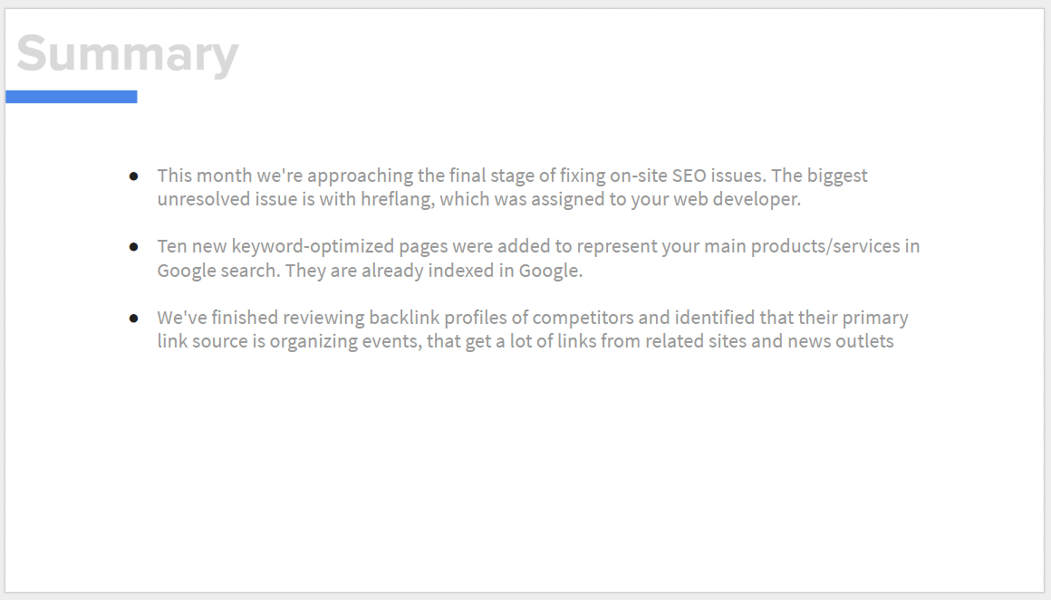 The summary page is an introductory page on your monthly SEO report that highlights what you hoped to achieve this month. It’s a great way to remind your client of what you’ve been doing together.