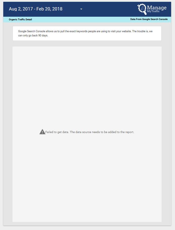 Some SEO monthly reports include two traffic pages, one for a basic overview of organic traffic, and one that offers a greater depth of information through Google Search Console. The Search Console system allows you to showcase clicks, impressions, and other important information according to your customer’s unique SEO goals.