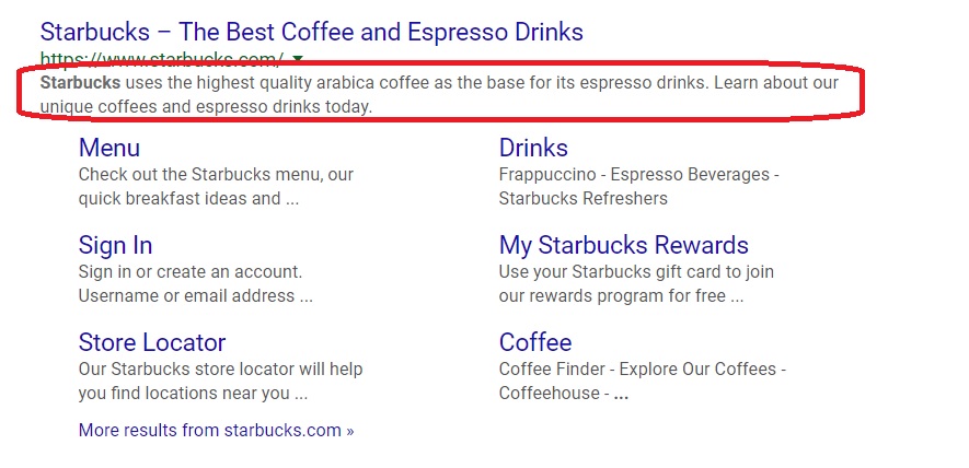 The world’s favorite coffee house offers a great example of how to use actionable content in your meta description. Their very first line of content includes the words “shop for coffee.” They’re telling you exactly what you can do on their website while using actionable language to guide user behavior. “Visit a coffeehouse near you” is another great call to action too.