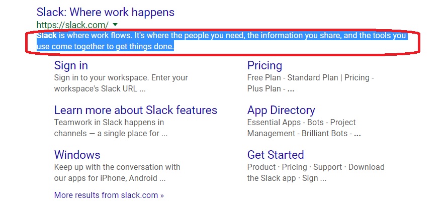 You’ll notice that Slack hasn’t used the full 320 characters available in their meta description. Instead, they’ve kept their snippet short and simple, conveying the simplicity of the application itself. Slack tells you exactly what you can accomplish by signing up for the app.