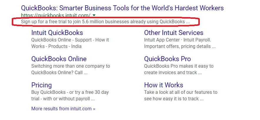 Finally, accounting software company QuickBooks offers plenty of useful information in their meta description designed to drive consumer behavior. You’re told you can use QuickBooks to track sales, profit, and expenses in an “Easy to Use” solution. The description also addresses customer concerns by letting users know that the service is “HMRC recognized” and pushes them to take action by reminding them that they can have a 30-day free trial.