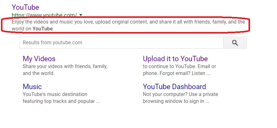 Great meta descriptions speak directly to the audience and let them know what kind of benefits they can get from clicking on the title tag above. For instance, YouTube’s meta description tells customers that they can share content with family and friends, and “Enjoy the videos and music” they love.